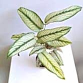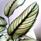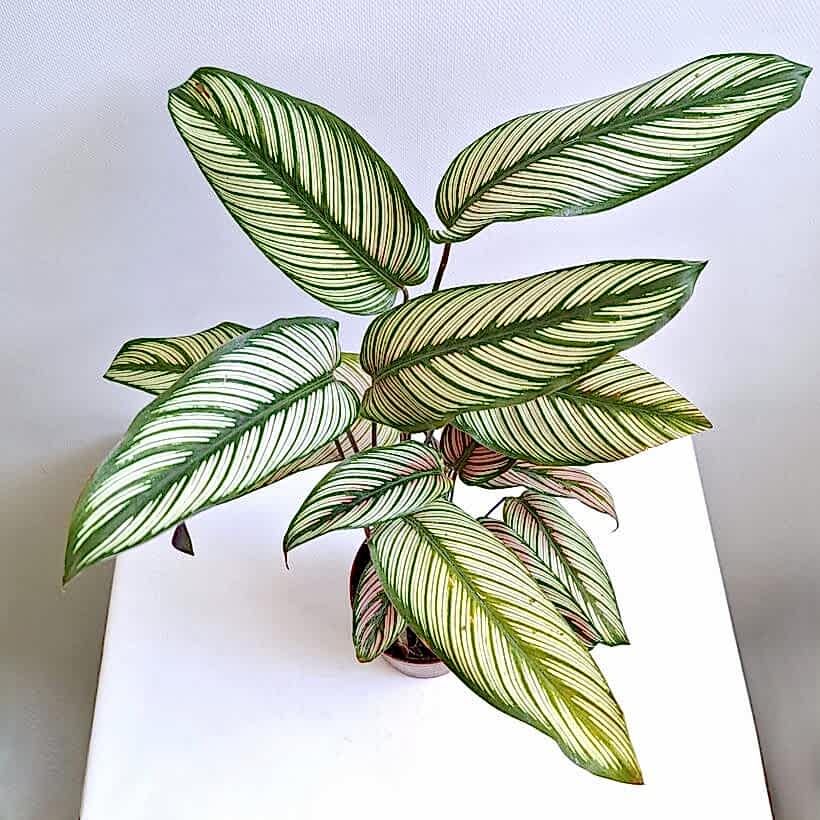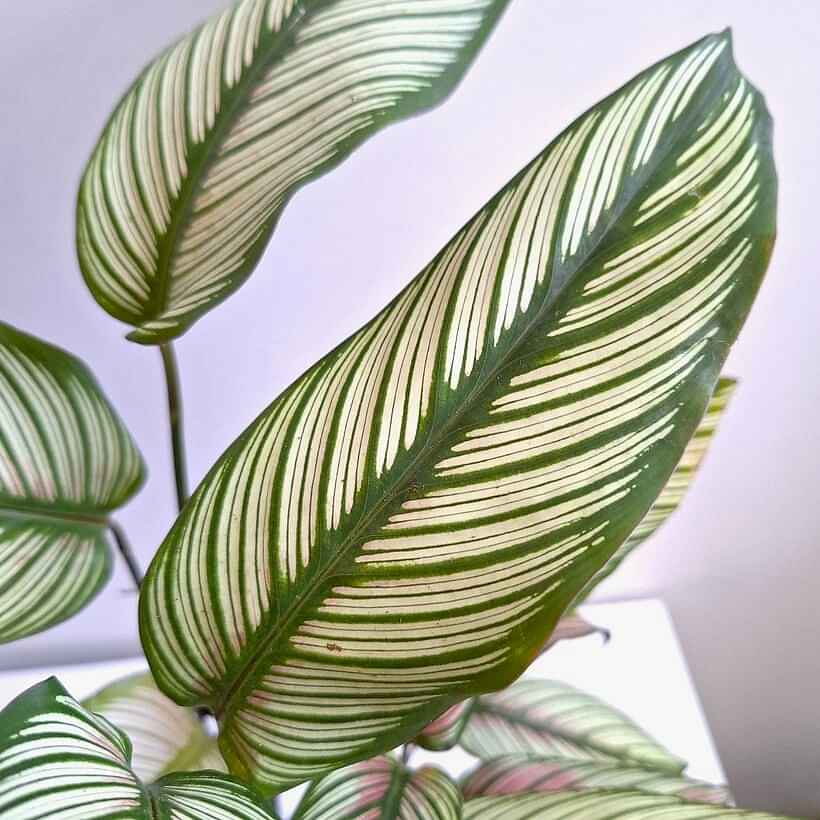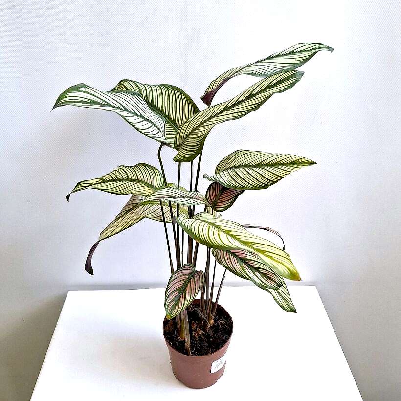 Калатея Мажестика Вайт Стар (Calathea majestica Whitestar) представляет собой уникальное растение с декоративными листьями. Листья имеют овальную форму и насыщенный белый цвет с нежным розовым оттеноком, который контрастирует с темно-зелеными жилками. Узор на листьях напоминает структуру рыбьих костей, что характерно для вида сандериана. Нижняя часть листа покрыта глубоким бархатисто-фиолетовым оттенком, придающим растению дополнительную декоративность. Длинные черешки обеспечивают вертикальный рост растения, что выгодно отличает его от других представителей рода.