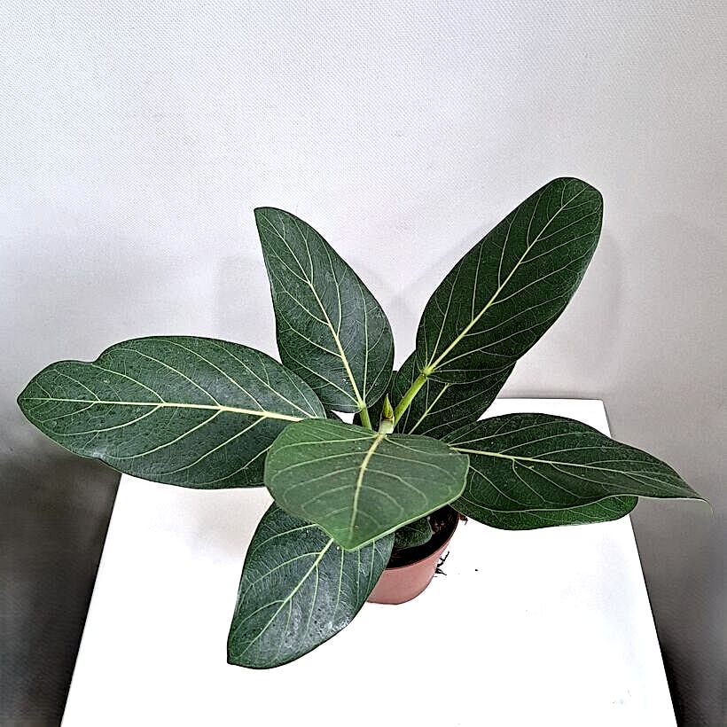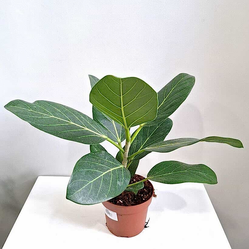 Фикус бенгальский Одри (Ficus benghalensis Audrey) представляет собой элегантное тропическое растение, характеризующееся крупными, глянцевыми листьями насыщенно-зеленого цвета. Овальные листья украшены тонкими бело-розовыми жилками, образующими изысканный узор на их блестящей поверхности. Поверхность листьев покрыта легким пушком, что придает растению особую привлекательность и мягкость.