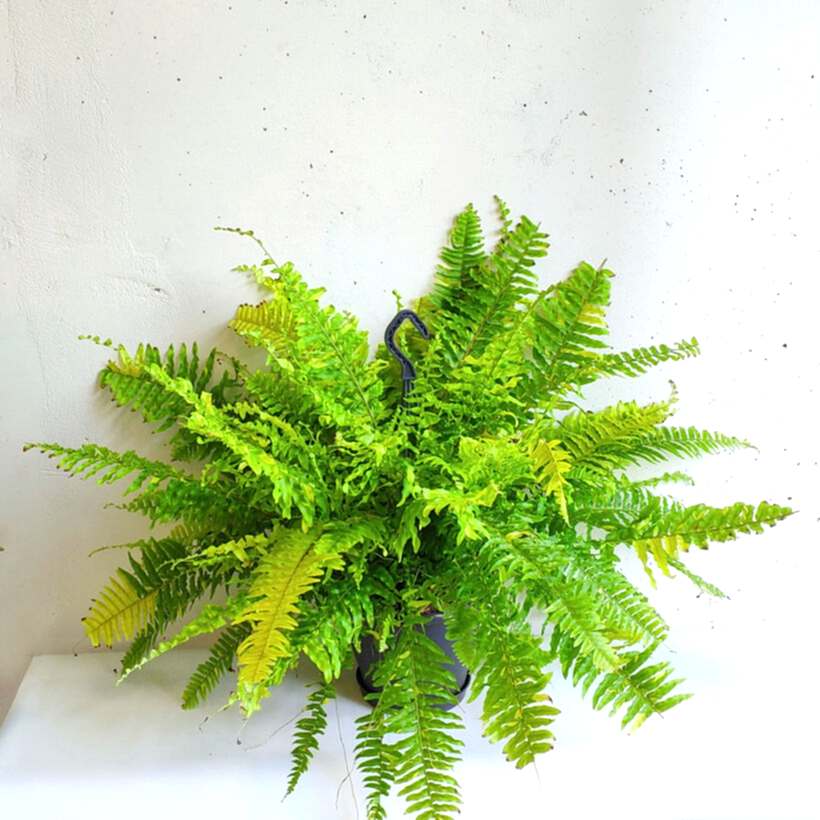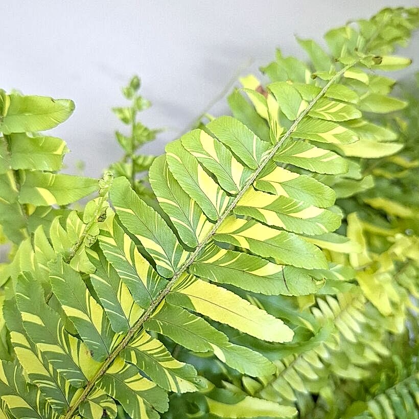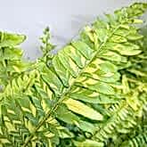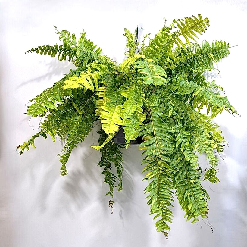 Нефролепис Тайгер (Nephrolepis Tiger) - вечнозеленое пышное растение с яркими зелеными золотистыми листьями, которые имеют интересный рисунок. Листья широкие и мечевидные, разрастаются в разных направлениях и могут иметь оттенки от золотистого до кремового и даже розового. Новые побеги и воздушные корни добавляют ему естественного вида. Для подчеркивания красивого потока густых листьев можно использовать подвесные кашпо или подставку, так как обычные горшки не создают такую изящность.